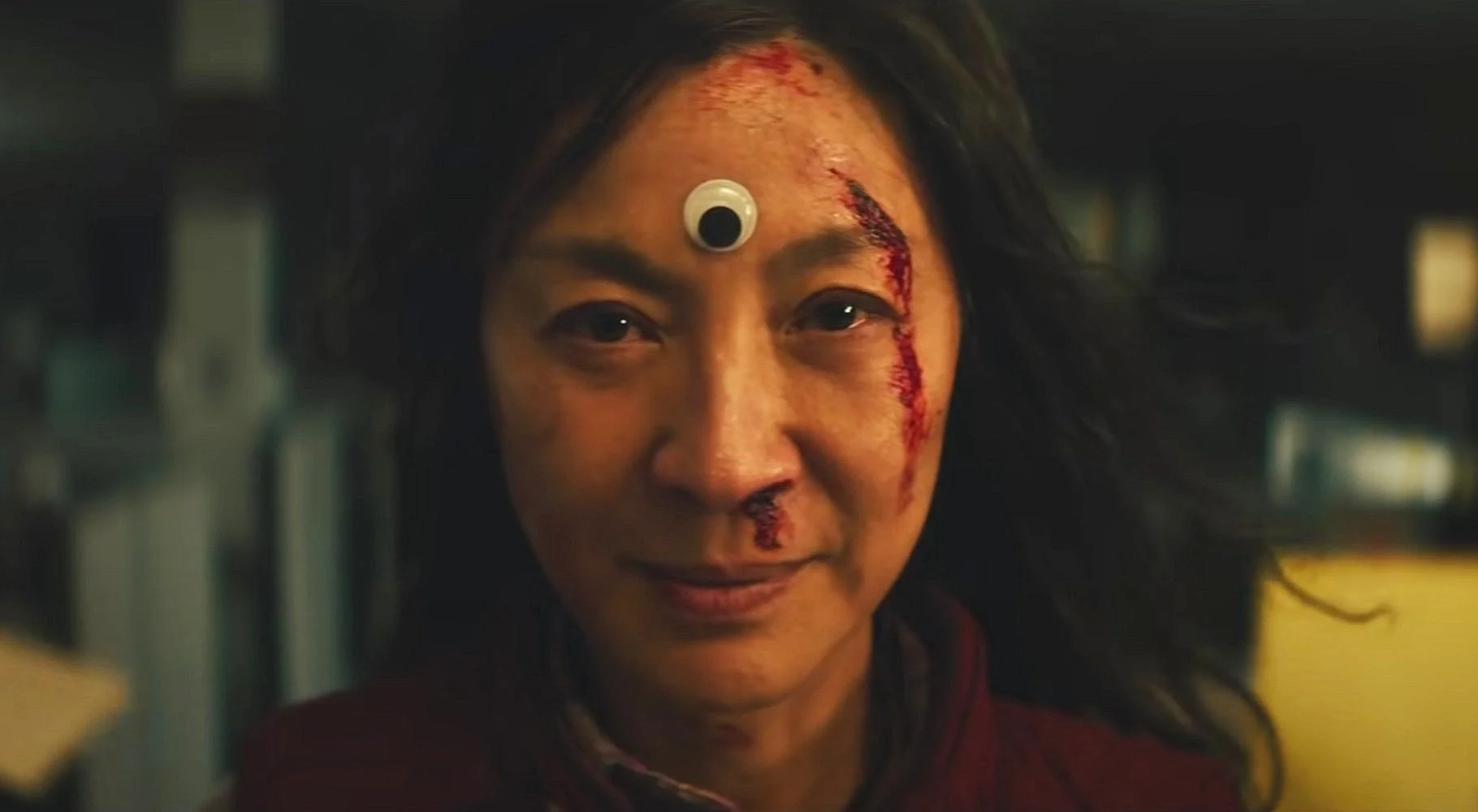 It all begins as a regular day in the known universe. Evelyn Wang (Michelle Yeoh), owner of a modest laundromat, is preparing a year’s worth of receipts as part of an audit by the IRS. She bustles through her day, juggling a kowtowing yet discontented husband, Waymond (Ke Huy Quan), a demanding father (James Hong), and a frustrated, alienated daughter, Joy (Stephanie Hsu), as well as plans for a Chinese New Year party. She is overwhelmed; it’s like her head is about to split.